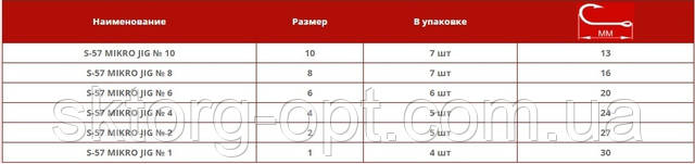 Спеціальний режим термообробки забезпечує готовому гачка належну пружність, його жало піддається подвійний хімічної заточуванні. Ідеальна голчаста форма жала дозволяє гачка легко пробити пащу будь-якого хижака, високий підчепивши і виражена борідка утримають видобуток на гачку при складному виведенні. Темне антикорозійне покриття гарантовано врятує гачок від іржі навіть у солоній воді і чудово маскує його, виключаючи виникнення відблисків. Доступна ціна і відмінна якість роблять S-57 кращим гачком для оснащення шарнірних монтажів при лові микроджигом.